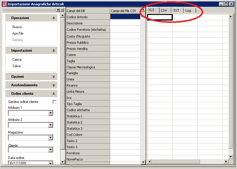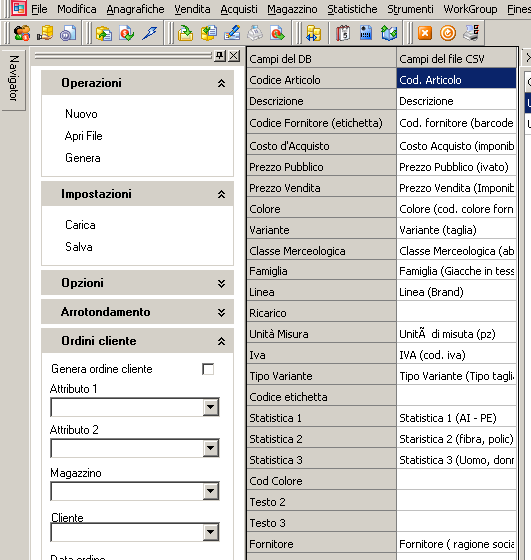 Al termine, è possibile salvare la mappatura in un file, da poter così richiamare ogni volta che si fanno import dello stesso genere. Basta cliccare su Impostazioni -> Salva e dare un nome al file (es.: mappatura per importazione anagrafiche articoli).